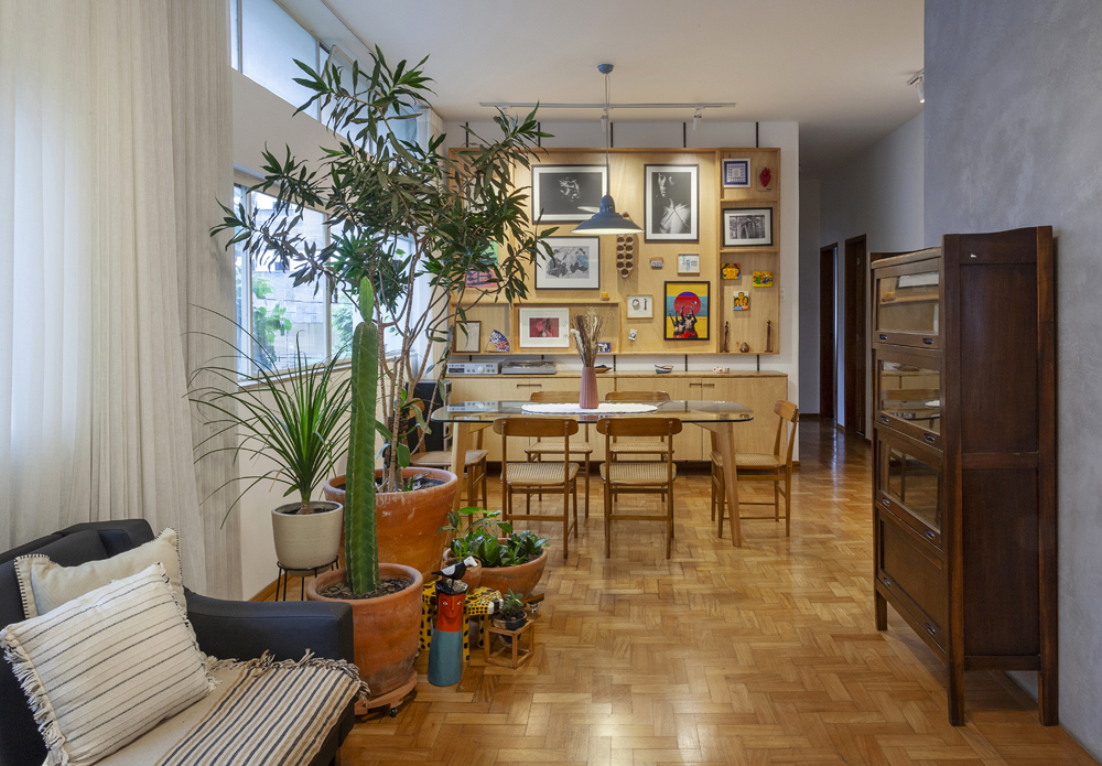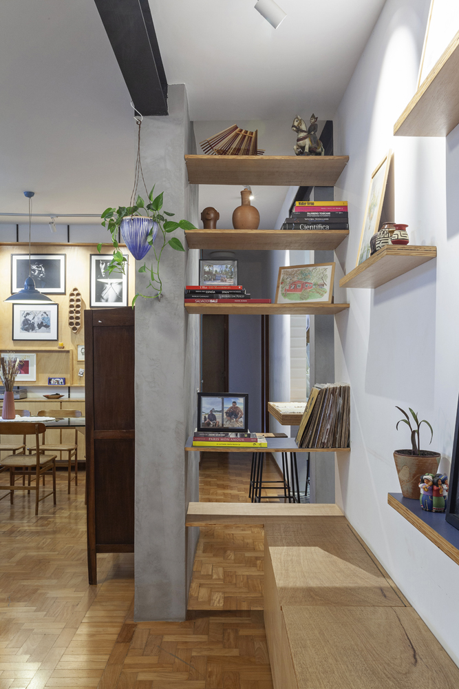 Com esta parede criamos uma estante vazada que faz a transição entre sala de estar, jantar e cozinha, delimitando espaços que se comunicam visualmente e ampliam as áreas comuns do apartamento. Assim, conseguimos também alcançar a janela para o interior do prédio, onde foi criada uma área semelhante a uma varanda, com direito a uma rede e uma jardineira.