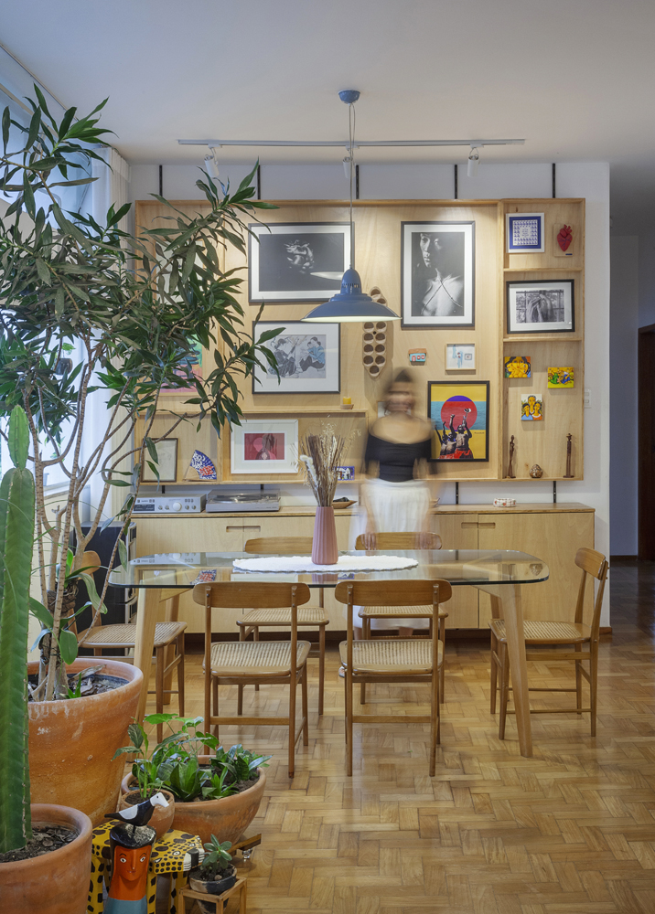 Para organizar todos os espaços de acordo com as necessidades dos clientes, foi desenvolvido um projeto de marcenaria que percorreu todo o apartamento. O material predominante foi o compensado, alternando entre a madeira natural e variações de cor. Escritório, sala de televisão, áreas molhadas e quarto receberam móveis pensados para que cada objeto encontre seu lugar. Destacamos o conjunto de buffet e painel da sala de jantar, feito em compensado, onde os clientes guardam seu acervo de objetos e imagens , que foram adquiridos ao longo dos anos através de viagens, trabalho e amigos.